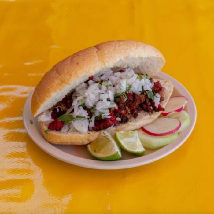 Bolillo con carne acompañado con cebolla, cilantro y salsa o guiso de su elección acompañada de lechuga, queso, crema y salsa.