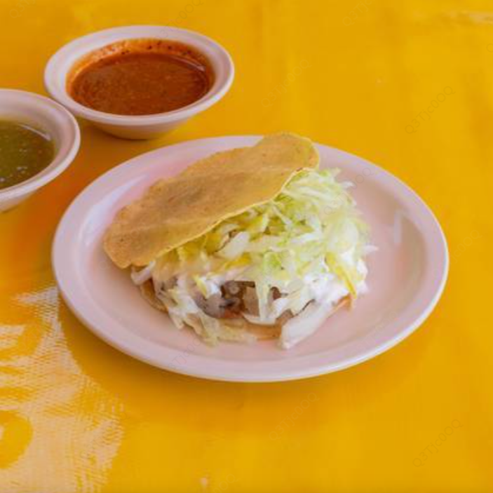 Sope de masa de maíz con frijoles y carne o guiso de su elección acompañadas de lechuga, queso, crema y salsa.