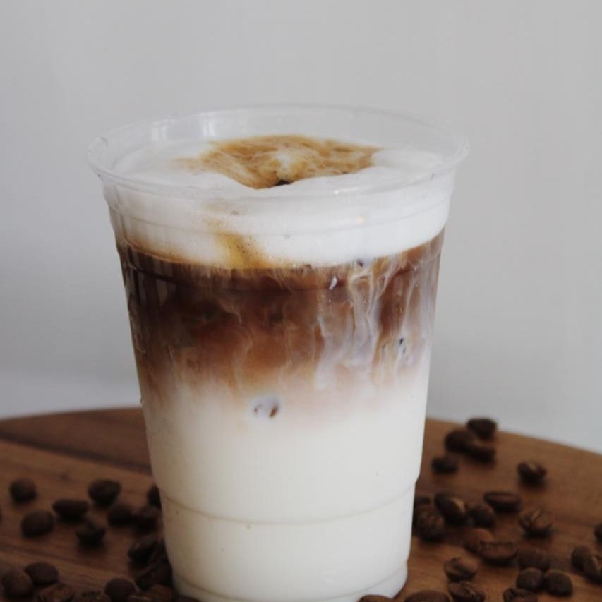 Latte frio de cajeta con leche deslactosada y nuestro espresso recien hecho.