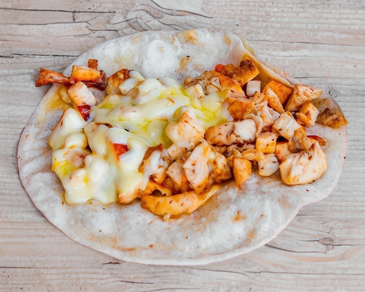 Rica carne de pechuga de pollo servida sobre tortilla de harina