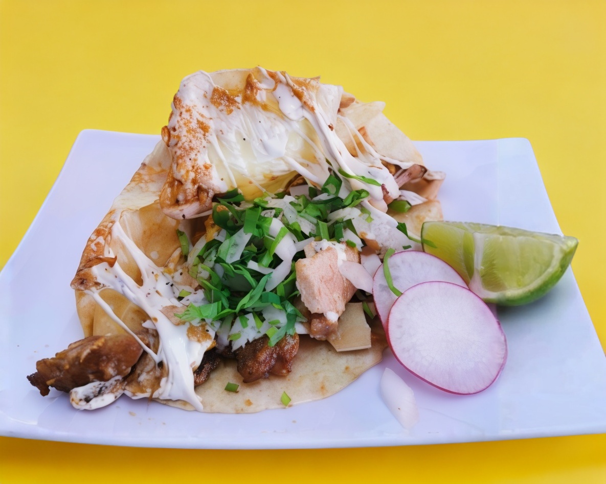 Tortilla de harina, queso de hebra y carnitas maciza con cuerito. incluye: cebolla, cilantro, limón y salsas.
