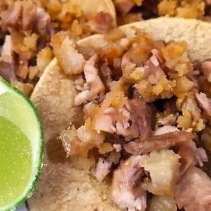 Doble tortilla y carnitas surtida. incluye: cebolla, cilantro, limón y salsas.