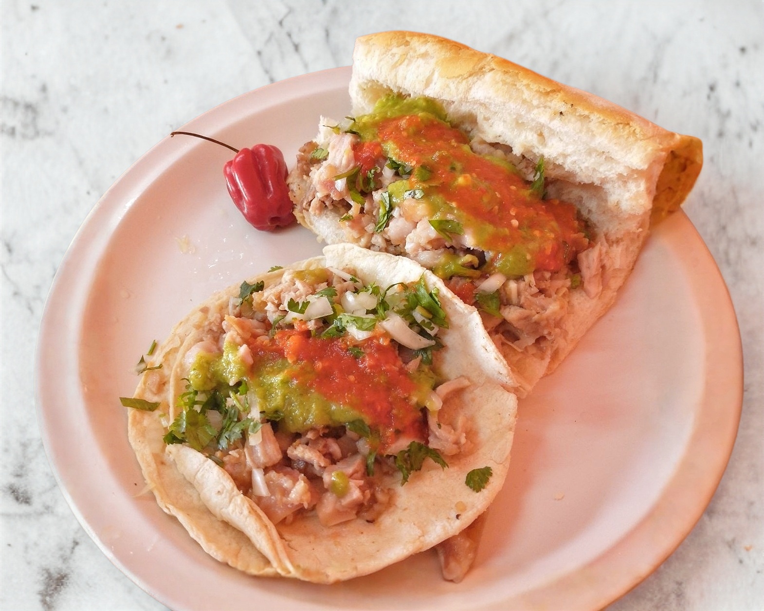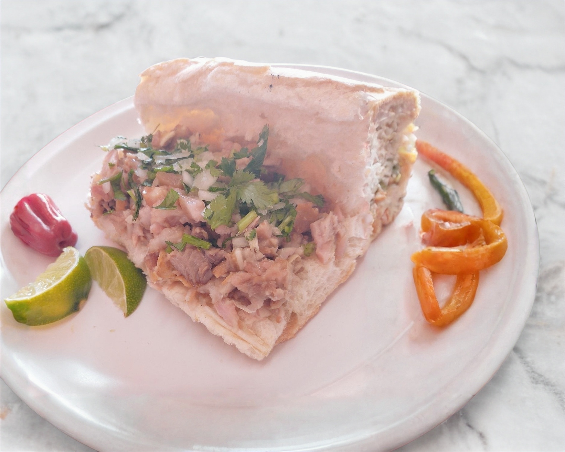 Torta de bolillo de carne suadero con frijol, carne asada, cebolla, cilantro, salsa verde y roja.