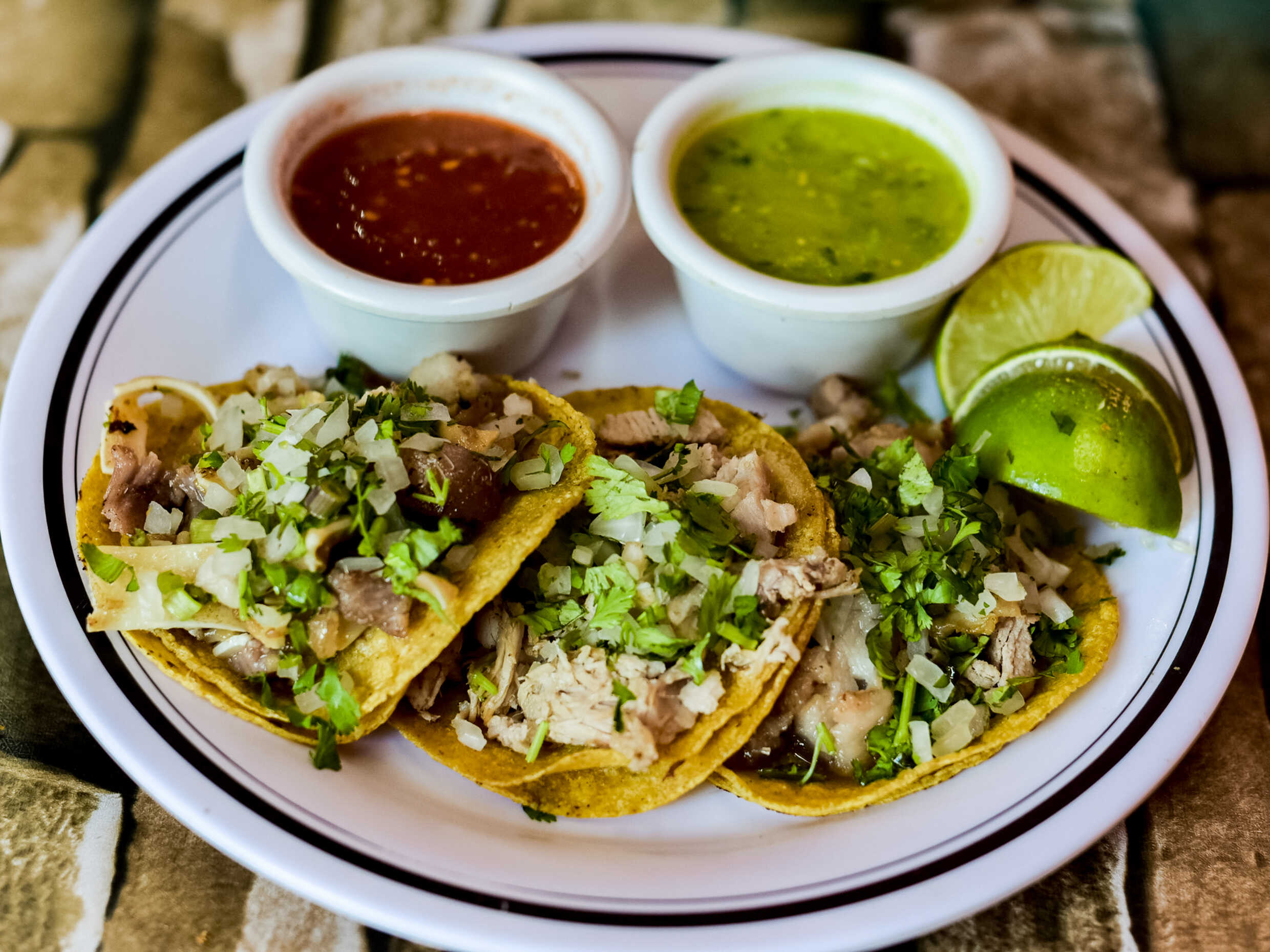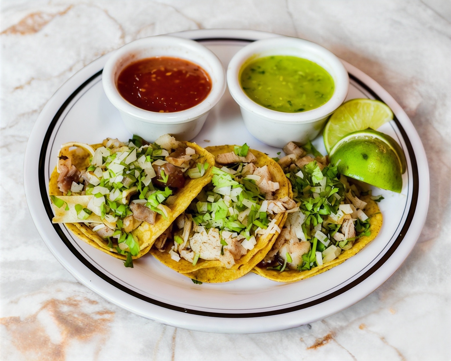 3 Tacos de asada acompañado con salsas, limones, cebolla y cilantro