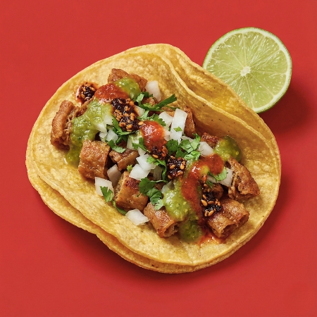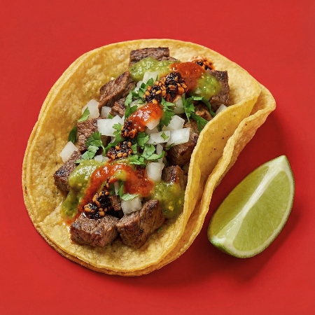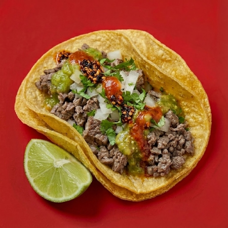 Taco de Bistec de Res, carne condimentada, freido con manteca y doble tortilla