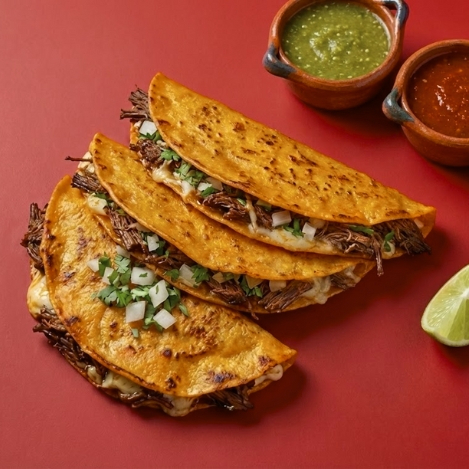 3 Quesabirrias grandes (22 cm), INCLUYE un vaso de Consomé, nuestras salsas, cebolla, cilantro y limón.