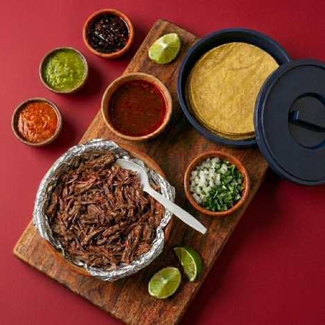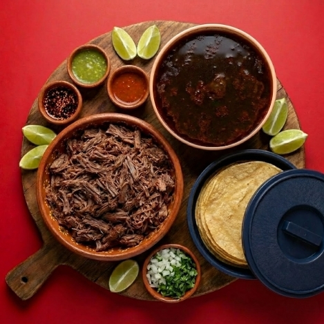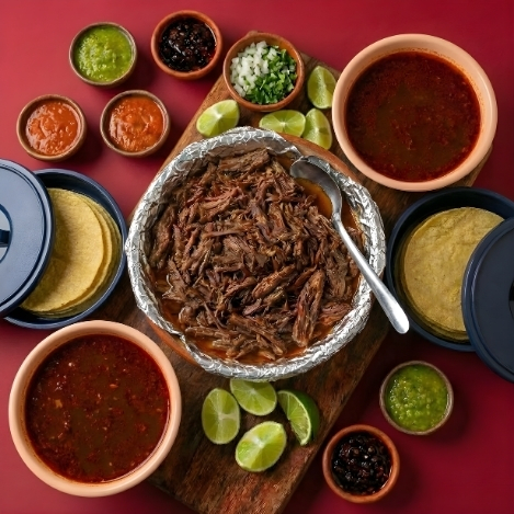 INCLUYE: 1KG De Barbacoa De Res O Surtido De Cabeza De Res, 1/2 LT De Consomé, Tortillas, Salsas (Verde, Roja y Macha), Limon, Cebolla y Cilantro