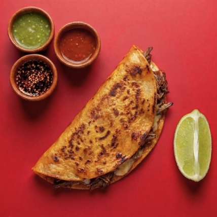 Nuestra deliciosa Quesabirria, cocinada con nuestra birria jugosa y combinación de quesos, incluye nuestras salsas, cebolla y cilantro (Tortilla Larga 22cm)