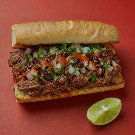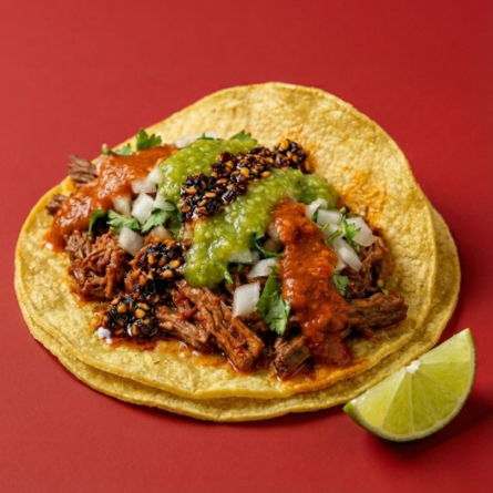 Taco de Birria de Res, cocinado en su salsa de chiles guajillo, ancho, condimentos y doble tortilla