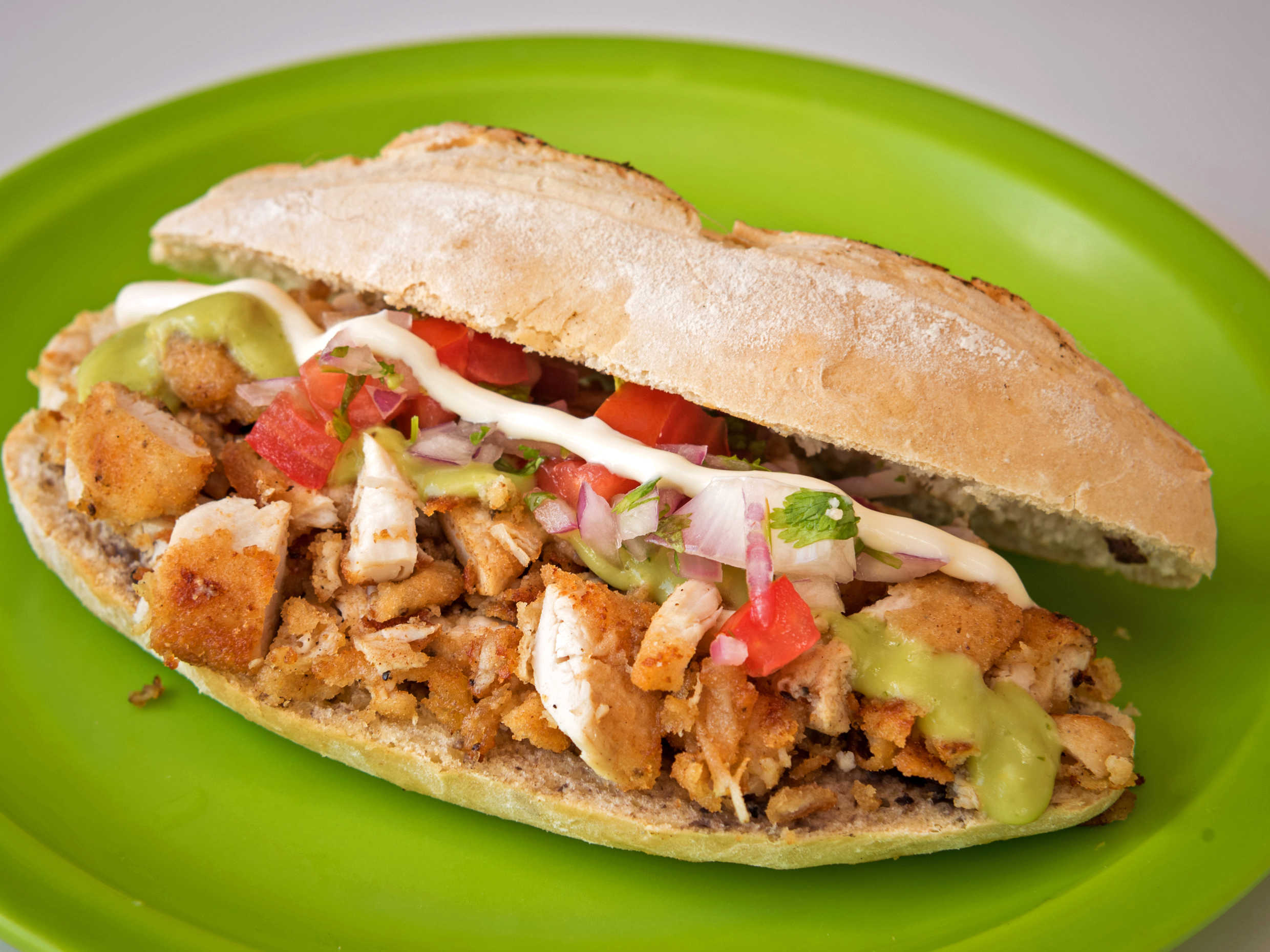 Pollo empanizado marinadas con ajo ,sal , pimienta acompañado con guacamole, cebolla,lechuga y frijol