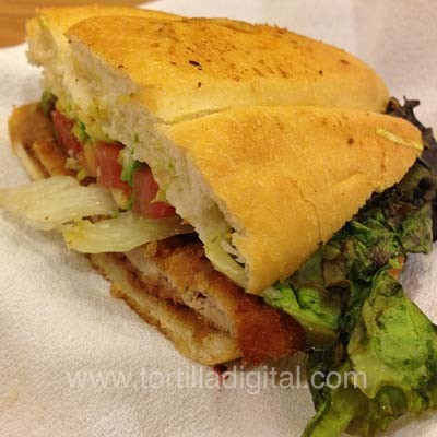 Empanizado lleva frijol, romanita, cebolla curtida, tomate y sus salsas.