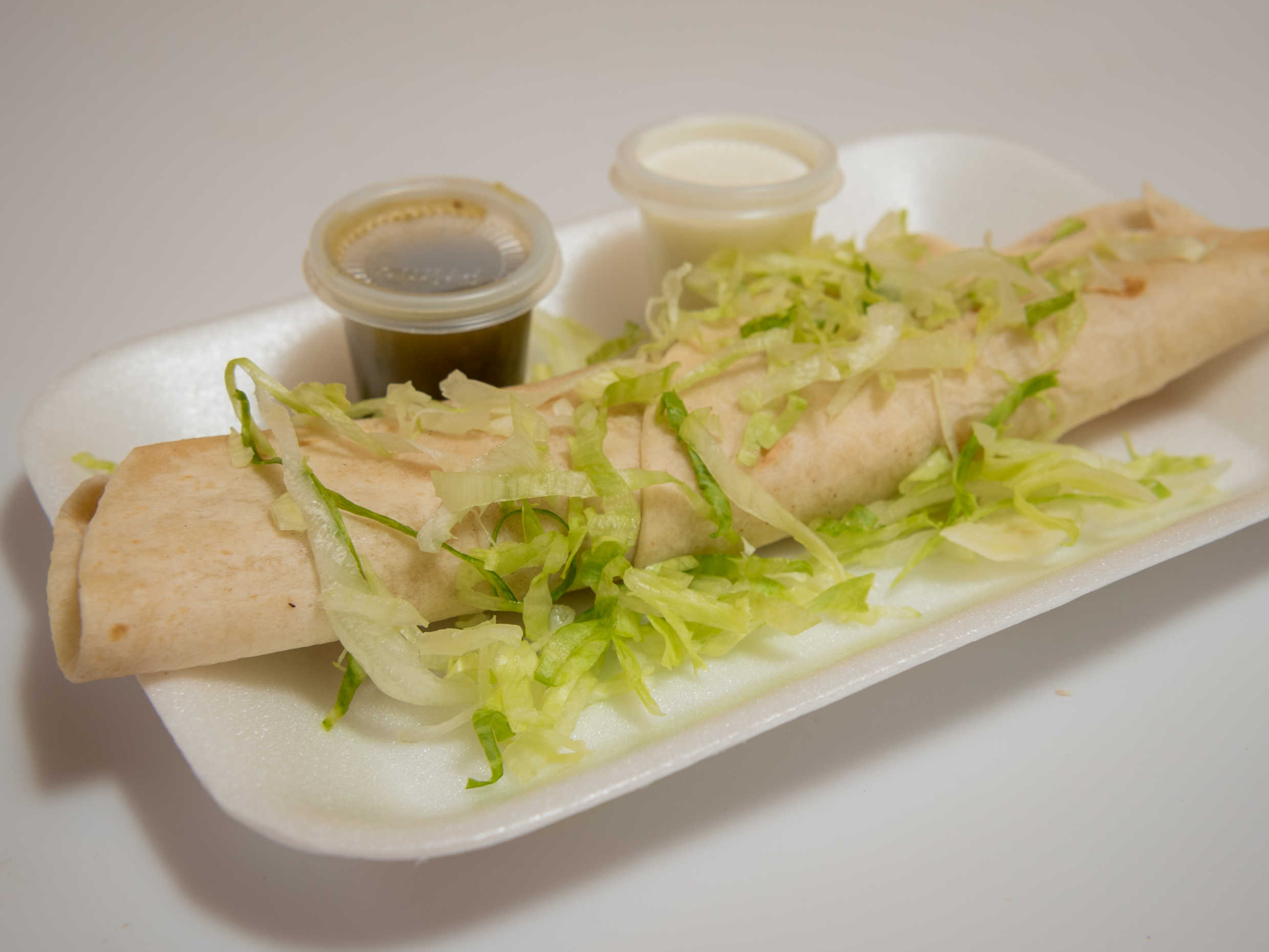 1 Pieza de masa frita rellena de queso y una carne con salsa y repollo.