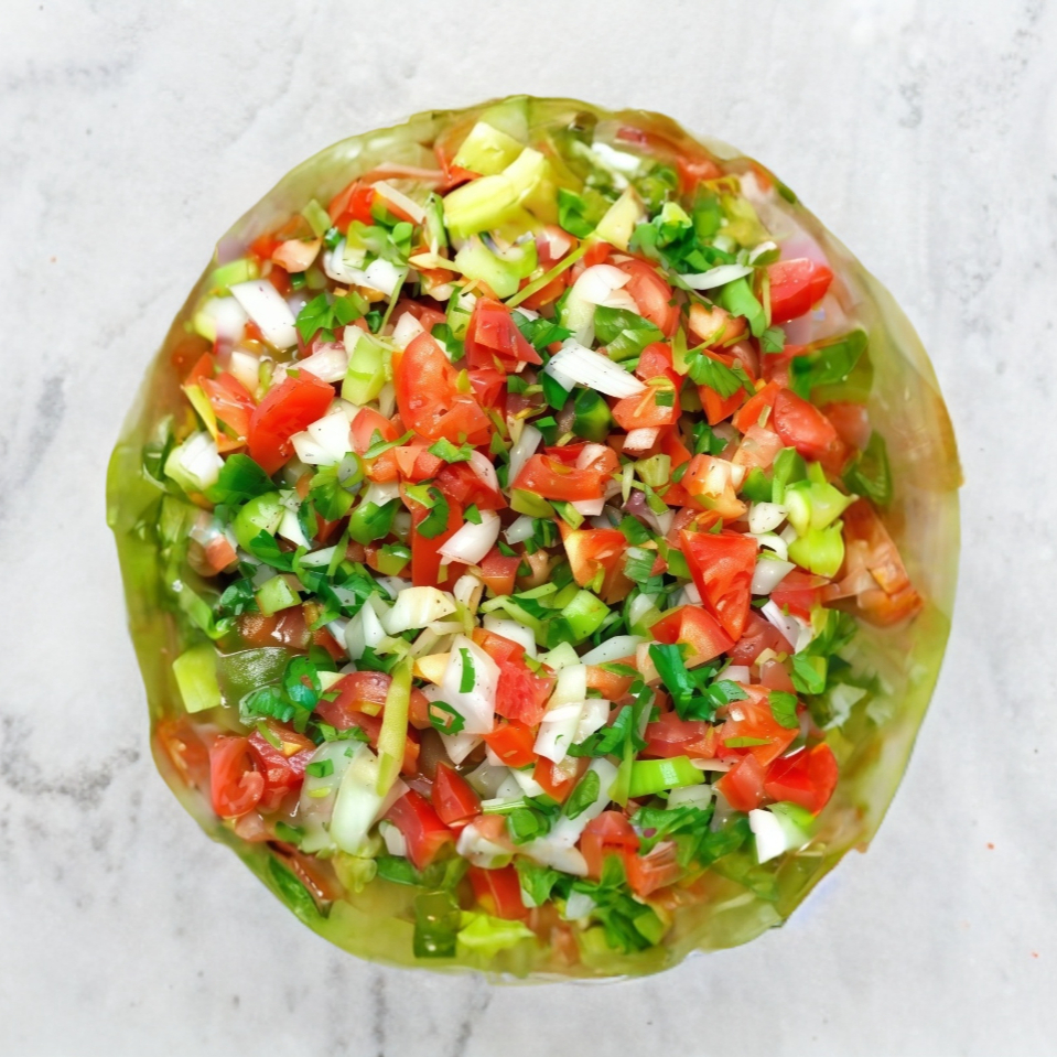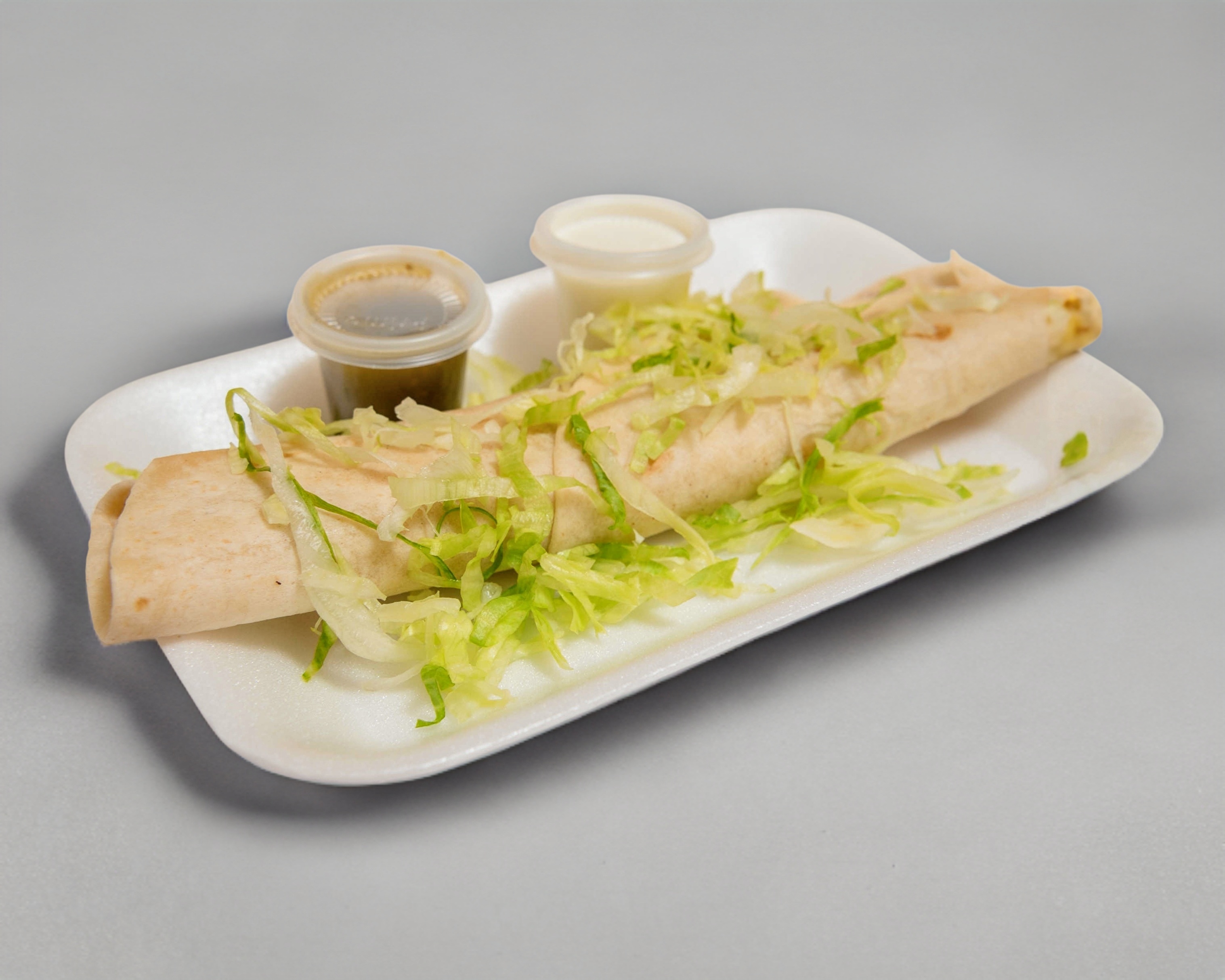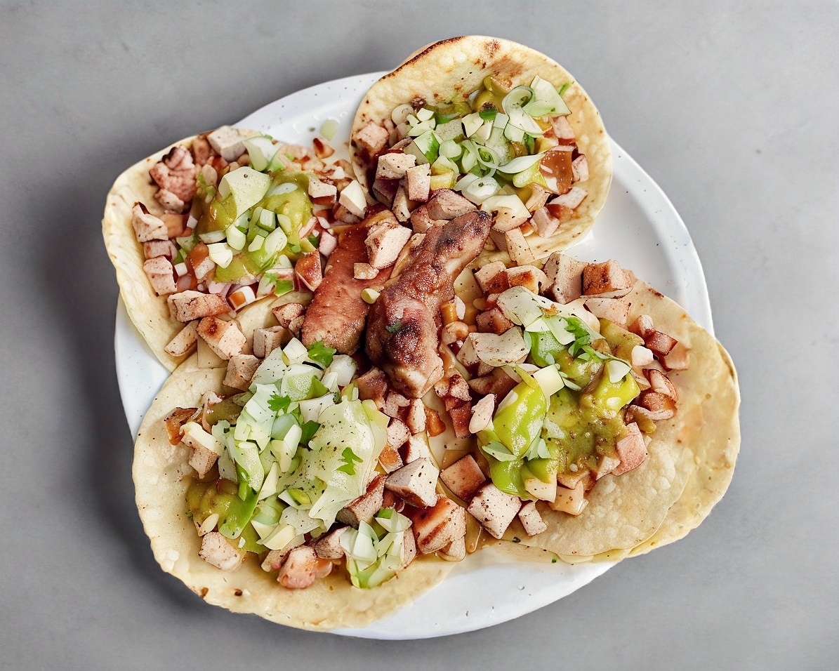 1 Pieza, 2 tortillas de maíz unidas rellenas de pollo con romanita, salsa verde y media crema.