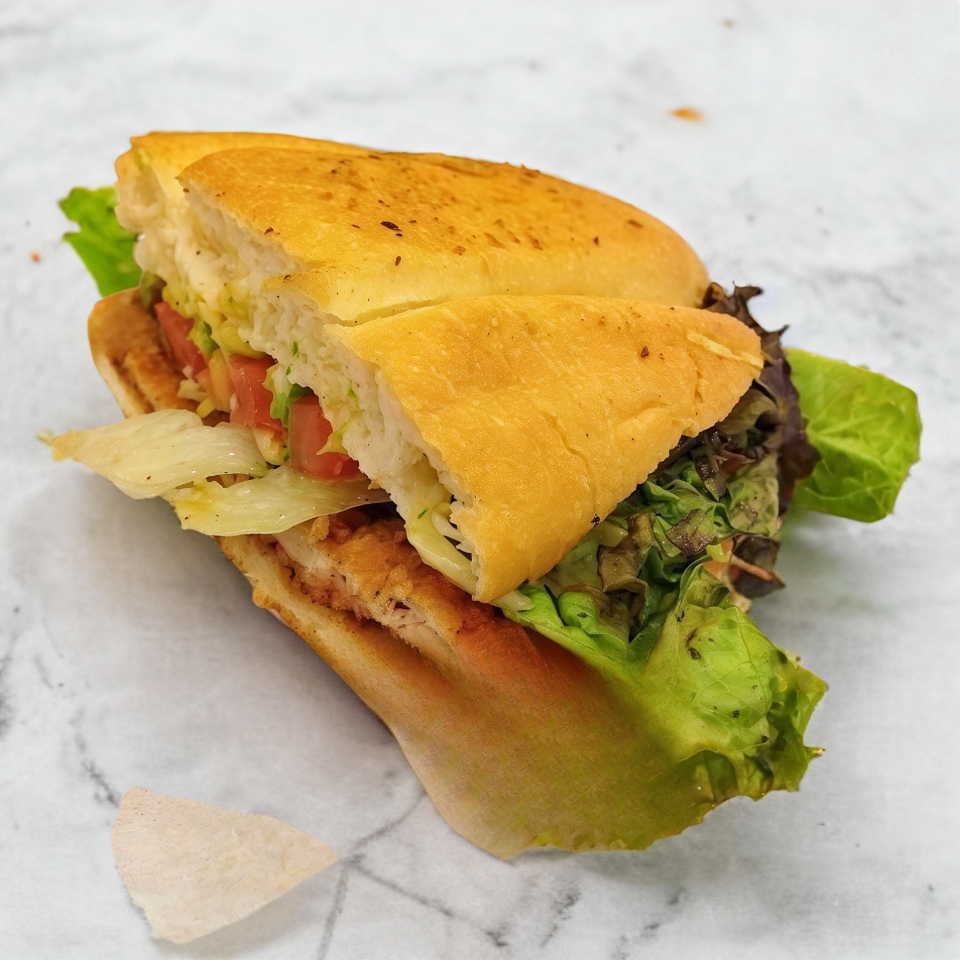 1/2 Barra de francés de leña con base de mayonesa, romanita, tomate, cebolla curtida. Incluye salsa roja, guacamole y picante.