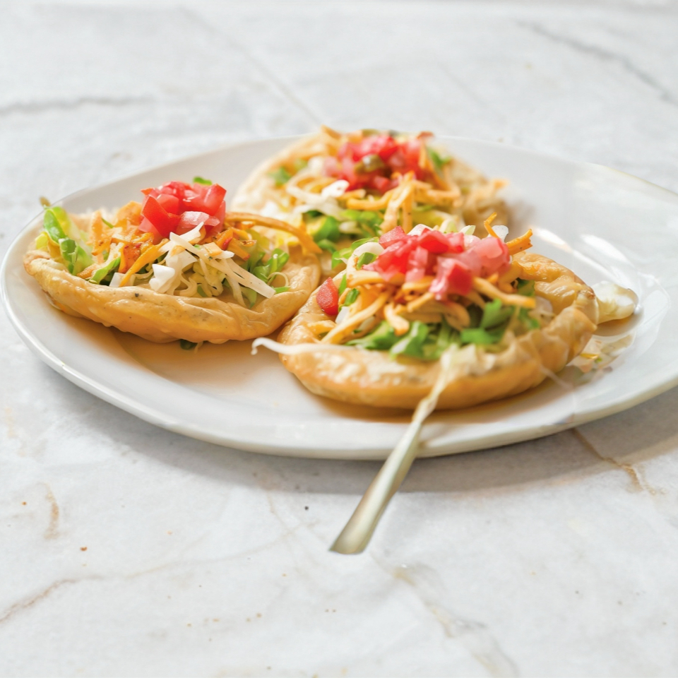 Dos tortillas de harina unidas con base de frijol carne a elegir (asado o empanizado) queso, romanita, media crema y picante.