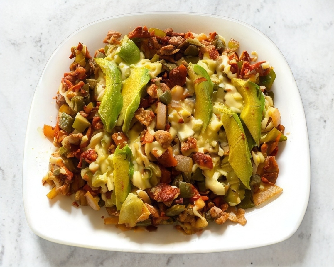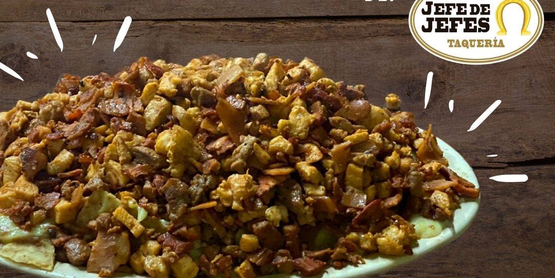 Nachos en base a totopos con frijol y carne de pastor, bistec, pechuga, chuleta, tocino, jamón y queso.