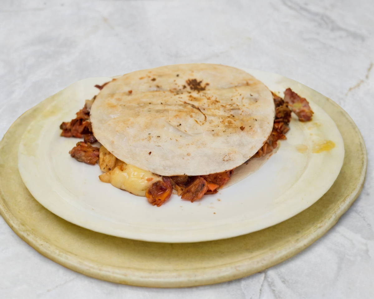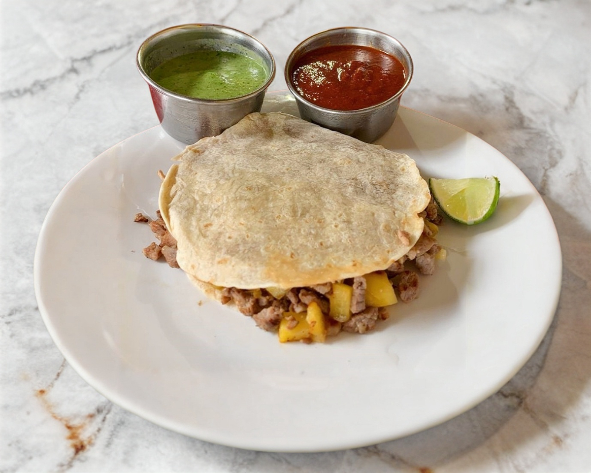 Tortilla de harina con carne de chorizo, queso y piña.