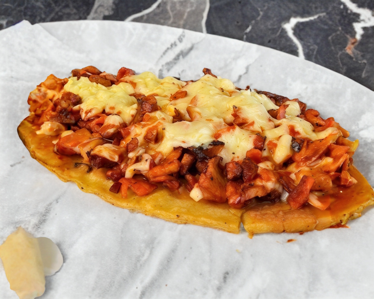 Huarache de maíz con carne de champiñón y queso.