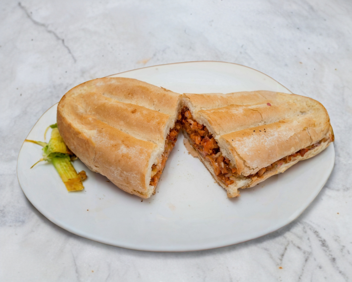 Telera con carne de pastor con queso.