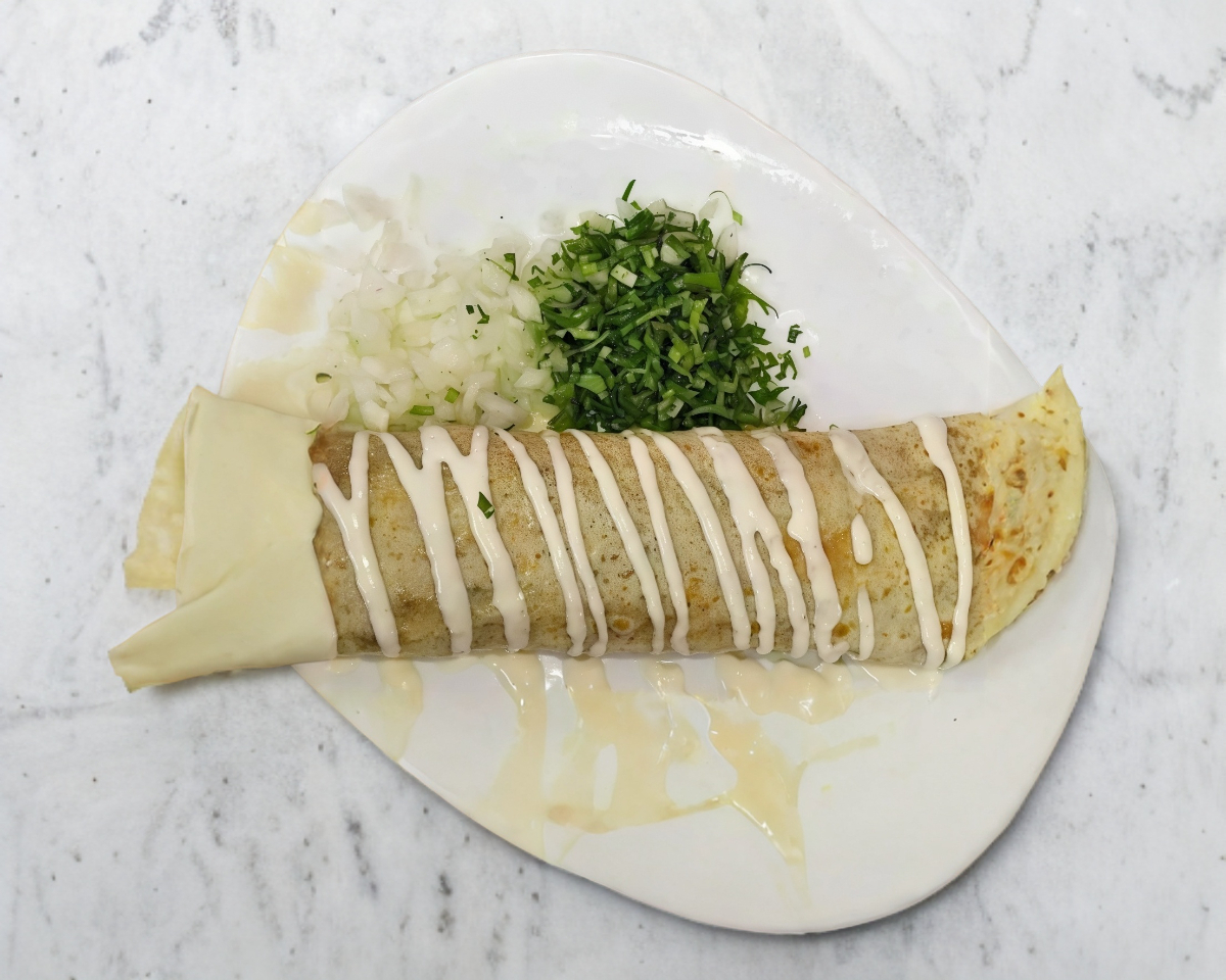 Tortilla de harina con carne de pechuga, queso y piña.