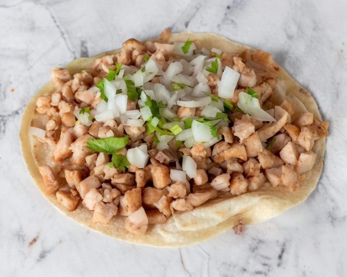 Tortilla a base de maíz o harina, con carne de pollo.