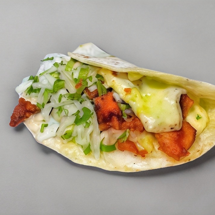 Tortilla de harina grande, proteína a elegir, con lechuga y tomate. Acompañado de salsas de la casa verde y roja.