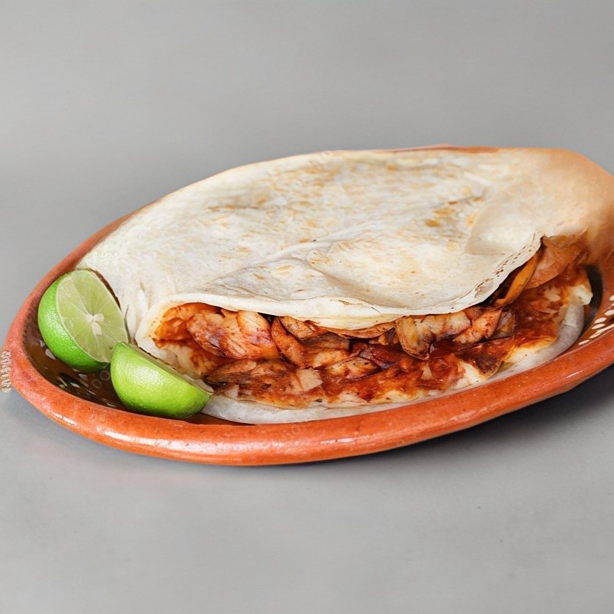 Tortilla de harina con queso y proteína a elegir, acompañado de las salsas de la casa verde y roja.