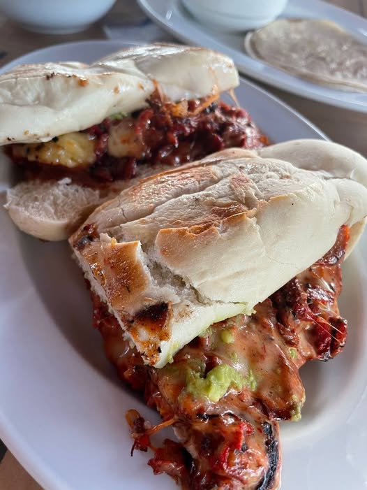 Media barra (aproximadamente 40 cm) con proteína a elección, acompañada de salsas de la casa verde y roja servidas por aparte.