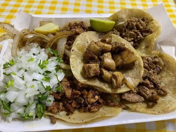 Tacos de asada con bebida.