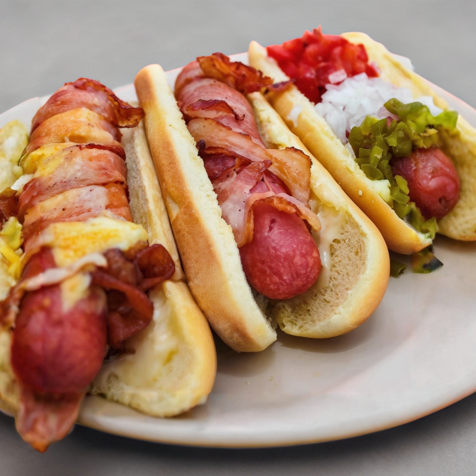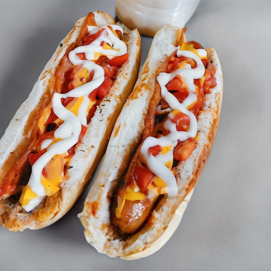 Pan de hot dog con salchicha de cerdo, cebolla, mayonesa, cátsup y mostaza.