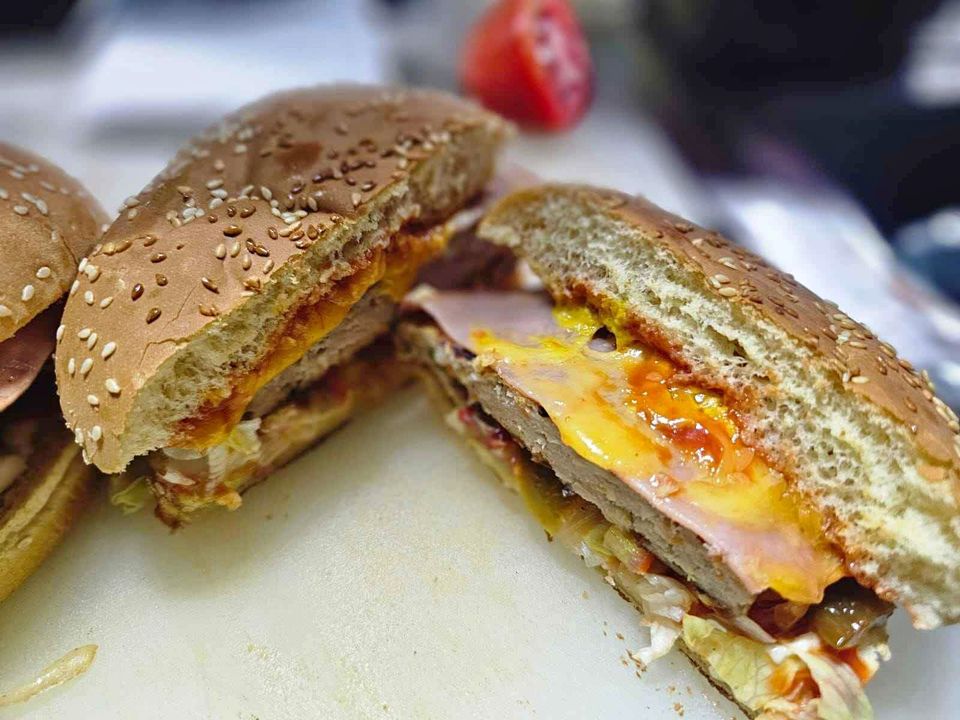 Pan de hamburguesa clásico, carne de cerdo, lechuga, tomate, mayonesa, cátsup.
