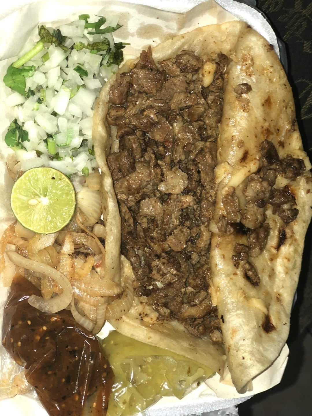 Orden de carne personal 200 g, incluye tortillas, y salsas de la casa verde y roja.