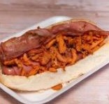 Salchicha, tocino, jamón, queso de nachos, cebolla y aderezos