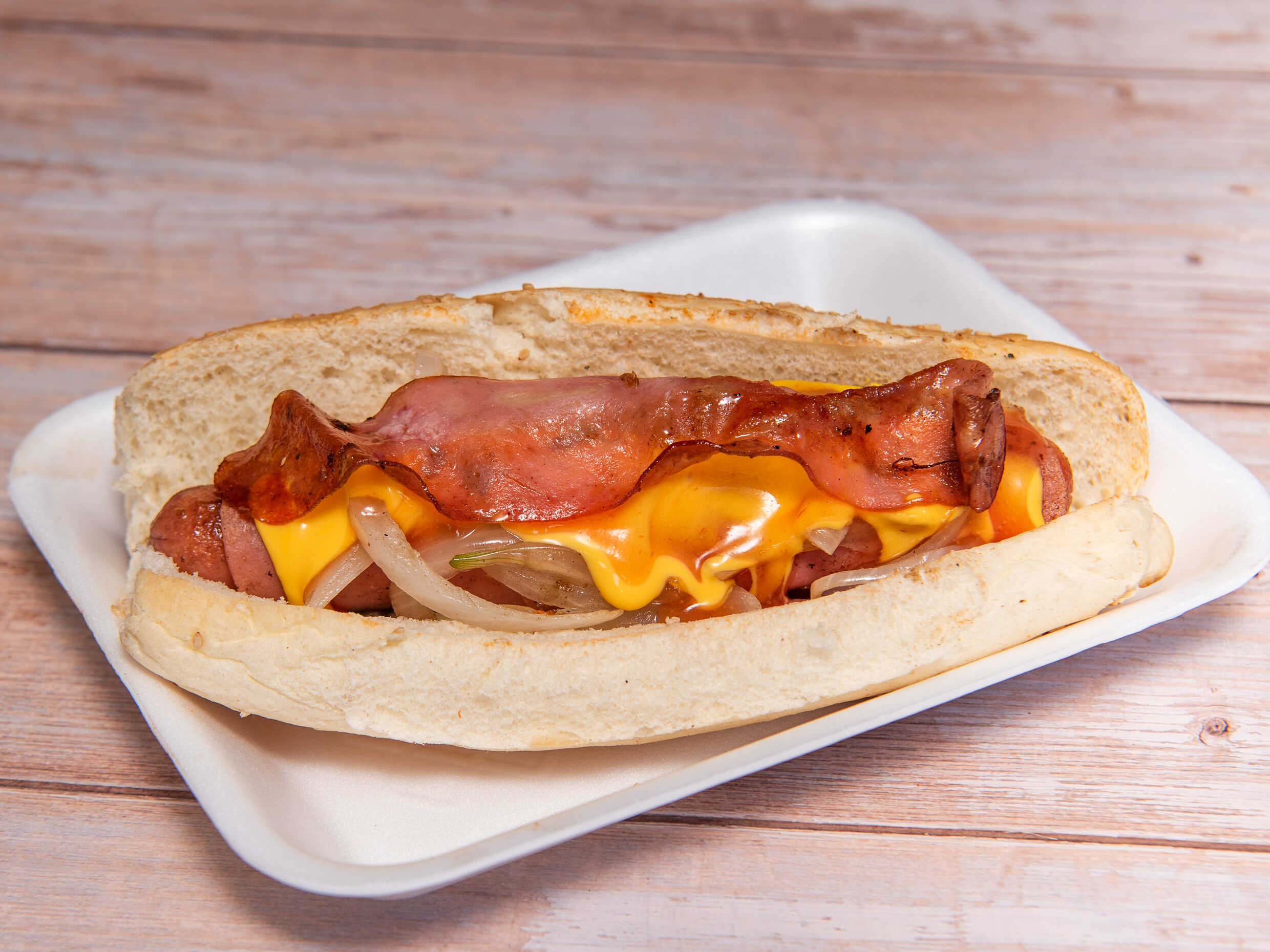 Salchicha, tocino, cebolla, catsup, mostaza y queso de nachos