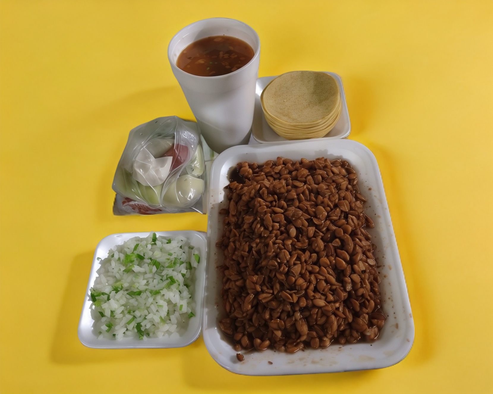 1/2 litro de frijoles charros cencillo, tostadas ,cebolla con silantro, limón y salsa