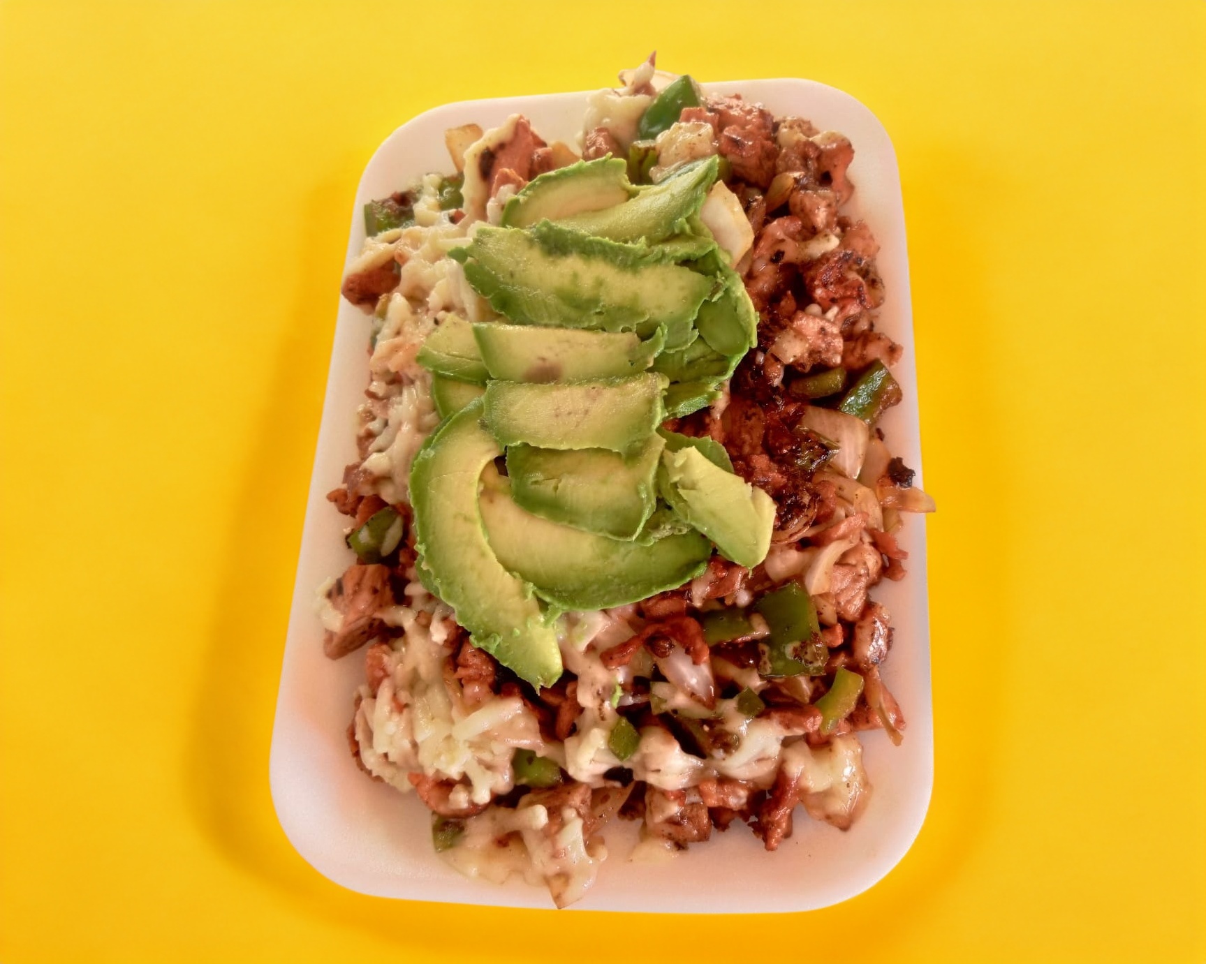 Bistec, cebolla, chile, jitomate, tocino y queso.
