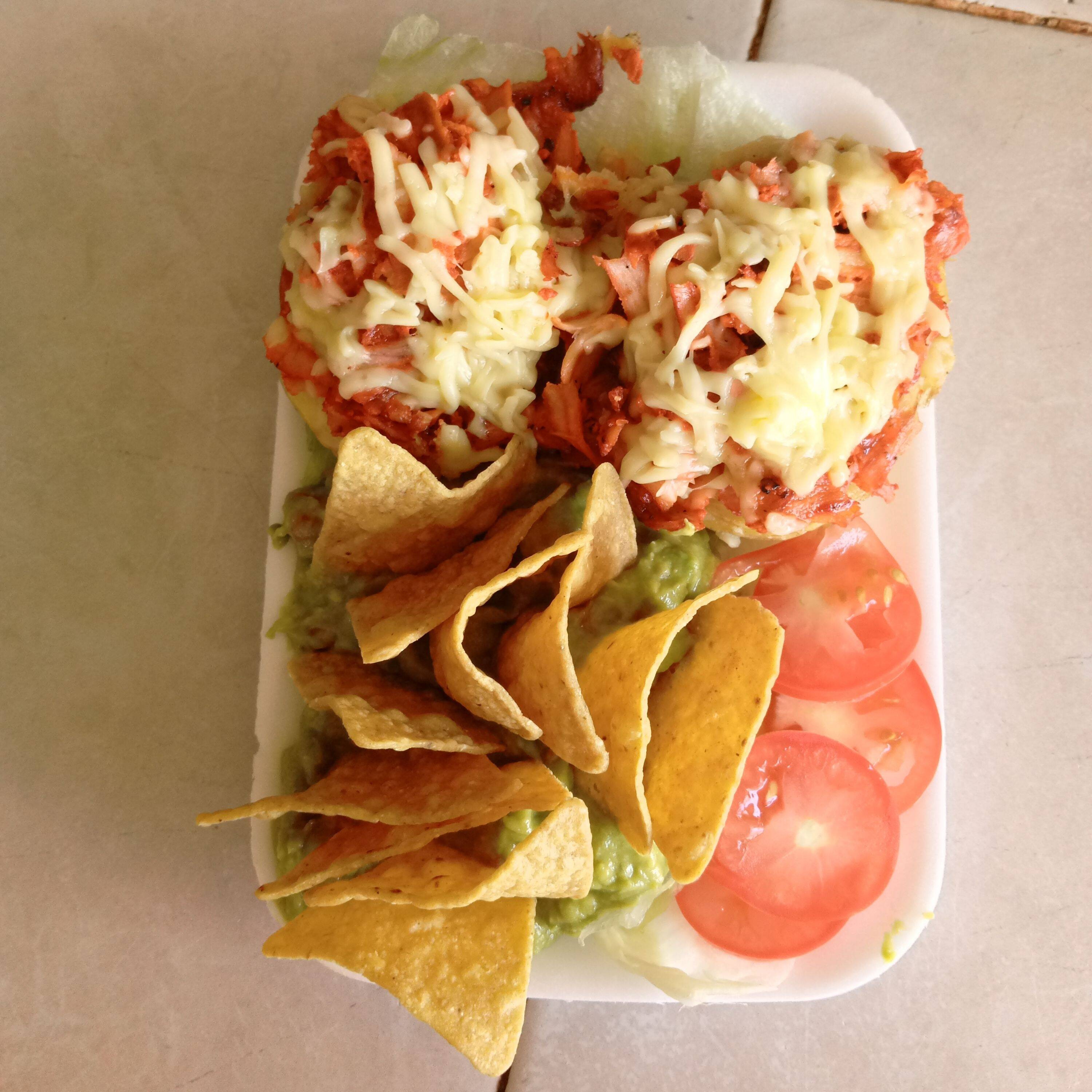 Pastor con chuleta, QUESO, ACOMPAÑADO DE GUACAMOLE, TOSTADA,TOMATE ,ROMANITA, SALSAS Y CEBOLLA CON CILANTRO