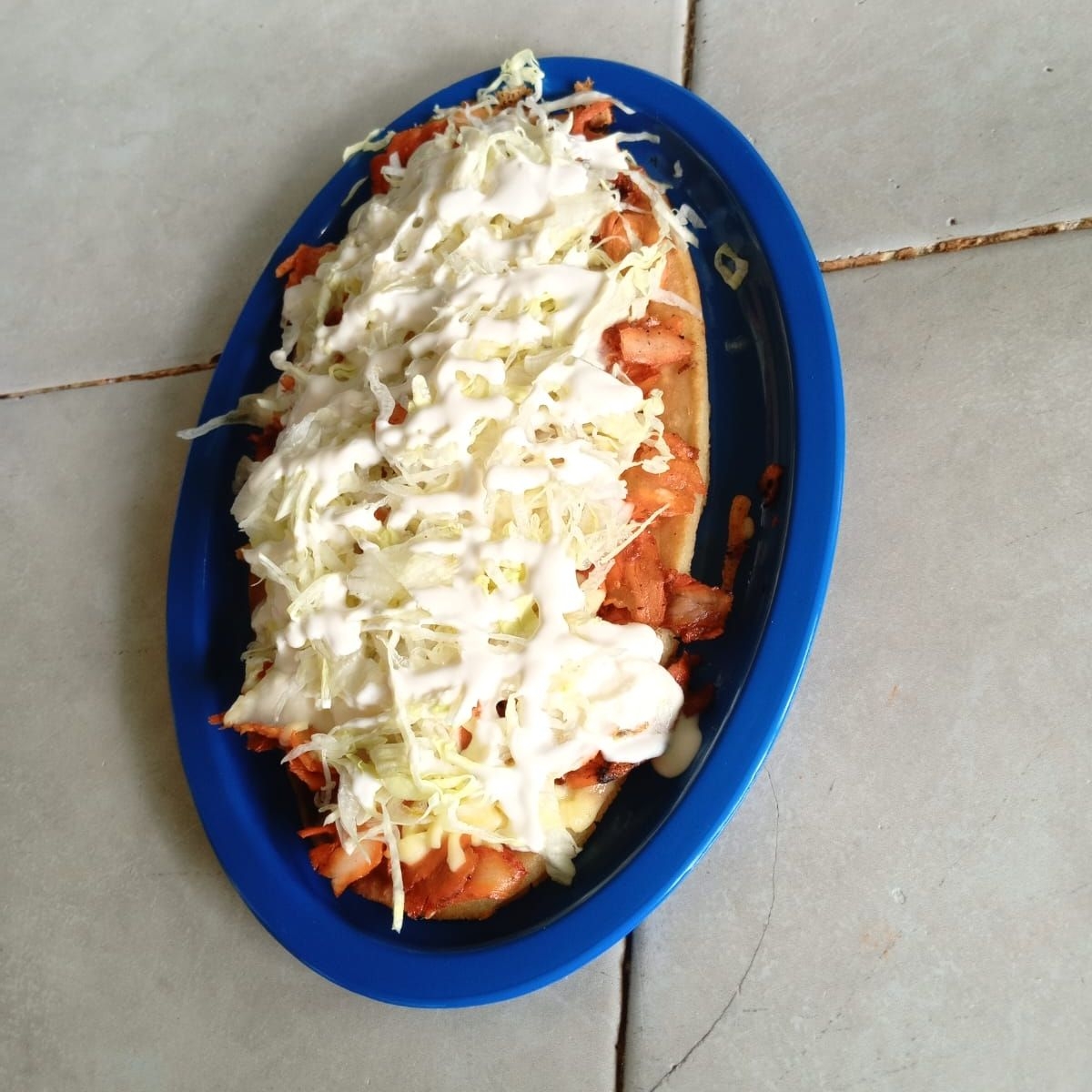 Nacho Mediano de pastor, tostadas, carne de pastor, frijoles y queso 3 salsa, crema de ajo y limón