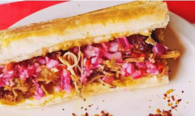 Torta elaborada con pan francés de leña, cochinita pibil, cebolla curtida con naranja y chile habanero picante.