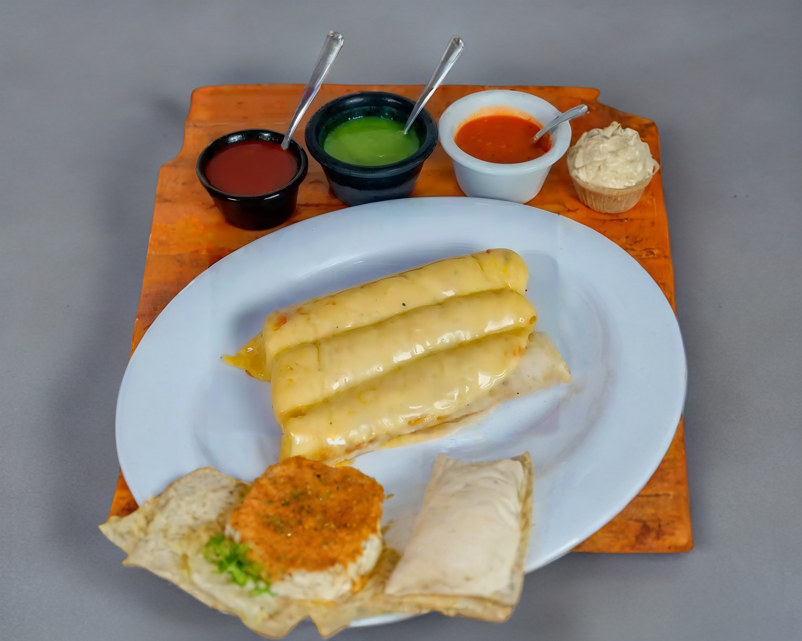 Orden de 3 burritos de pastor, bañados con queso fundido y salsa especial.