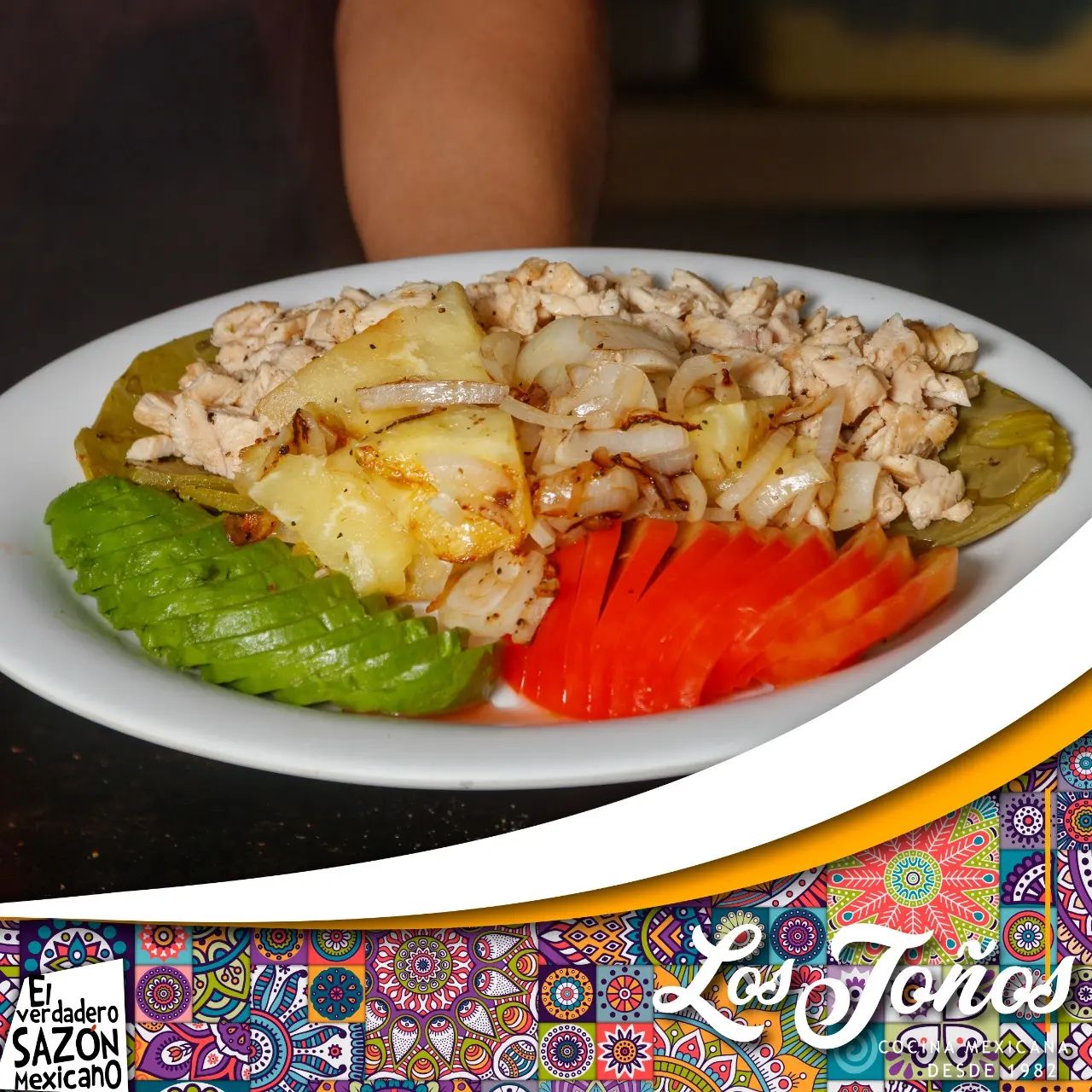 1 Porcion de pollo sobre una cama de nopal, acompañado de aguacate y cebollitas.