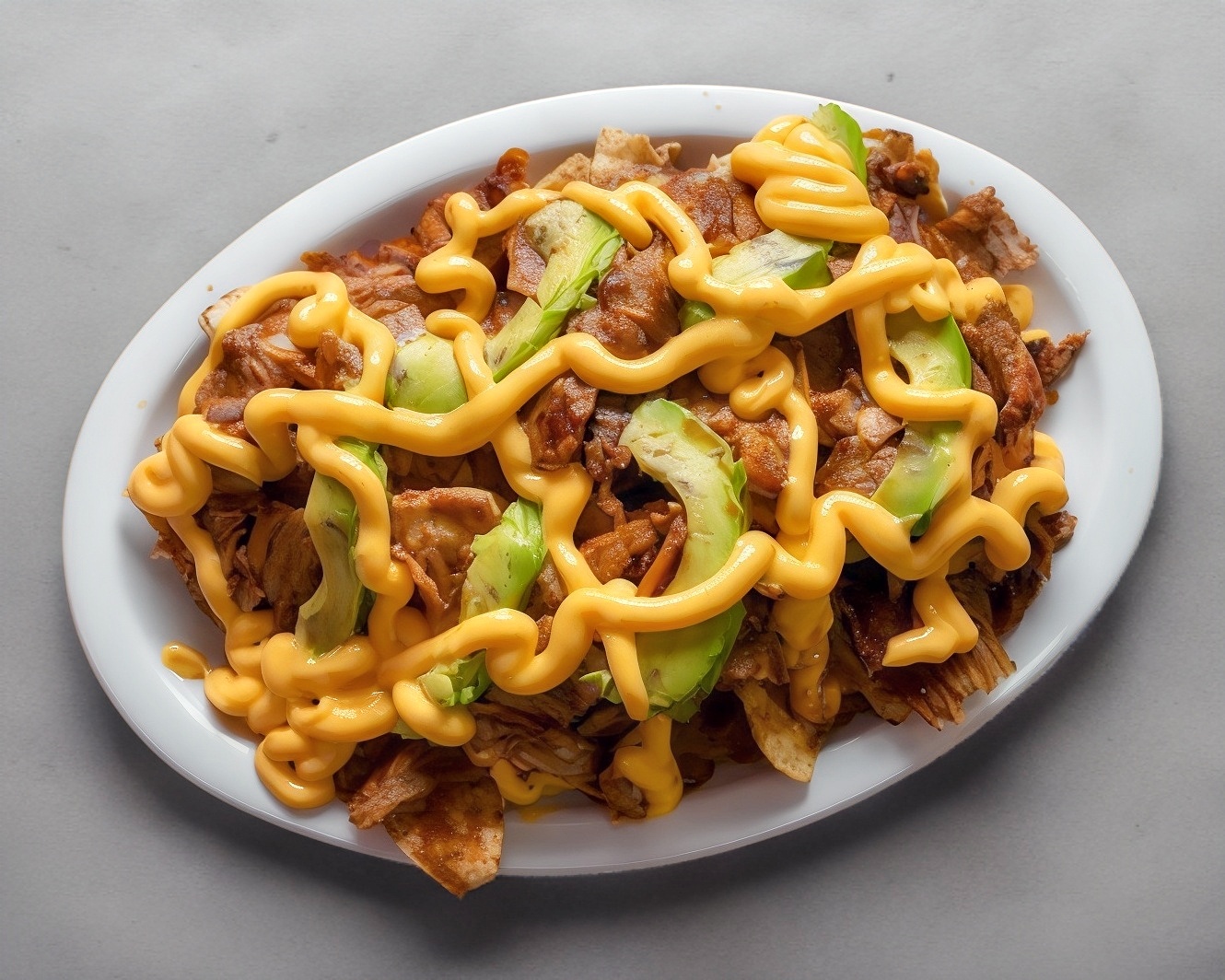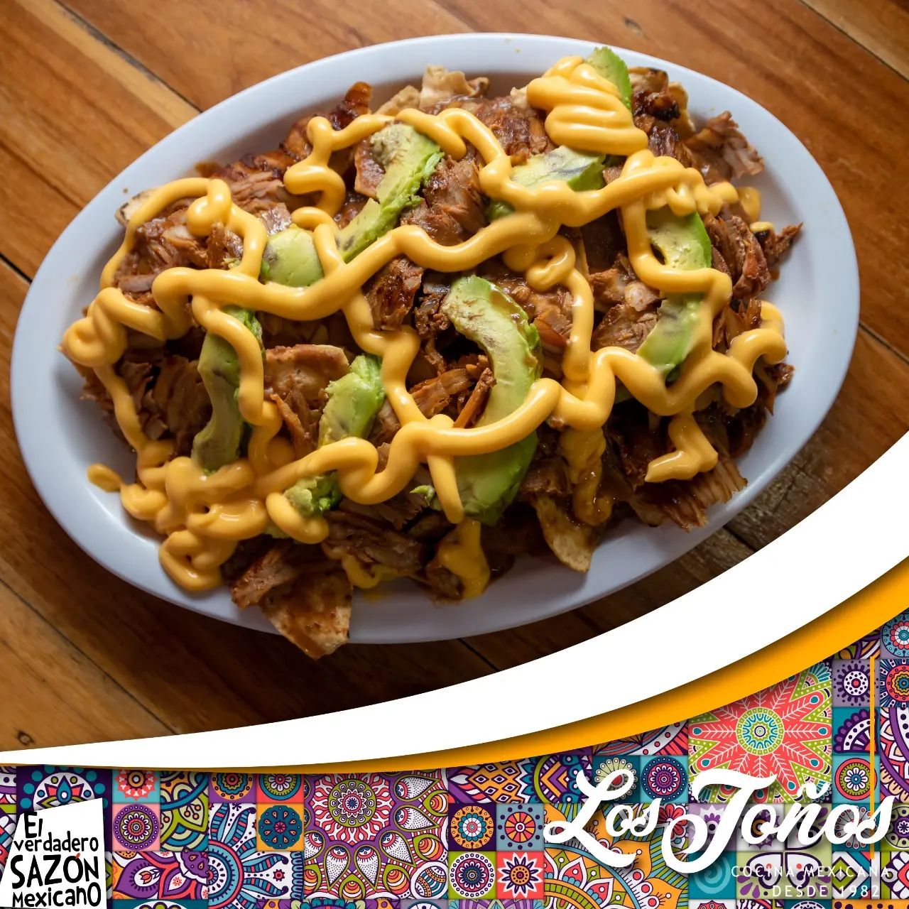Cama de nachos con carne al pastor, aguacate y queso amarillo.