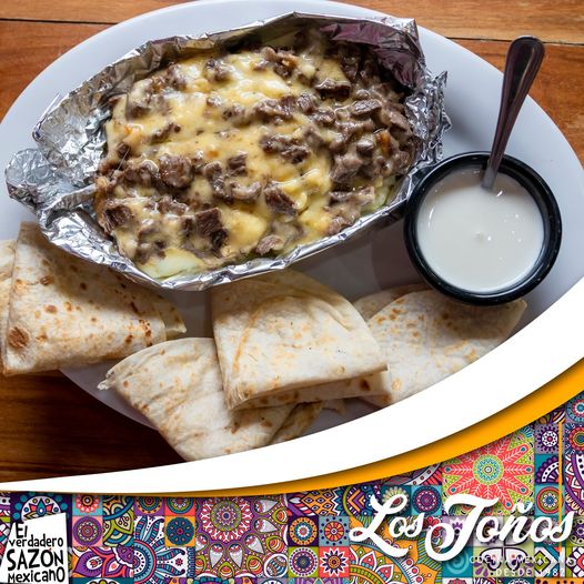 Papa rellena de arrachera y queso.