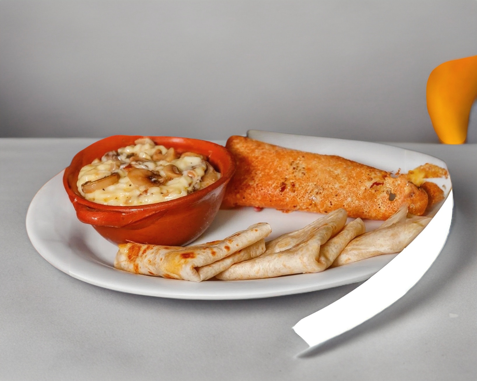 Tortilla de harina rellena de queso derretido y pollo.