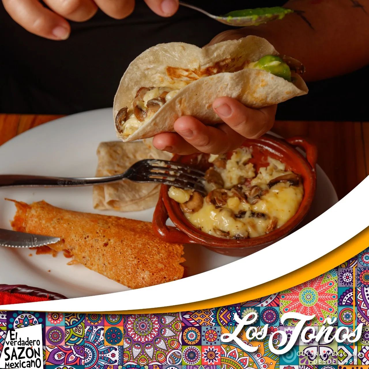 Tortilla de maíz con cachete, cebolla, cilantro y picante.