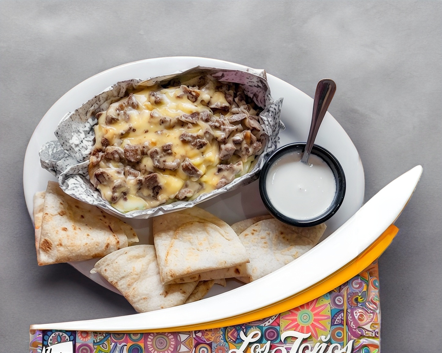 Tortilla de harina rellena de queso derretido y carne de sirloin.