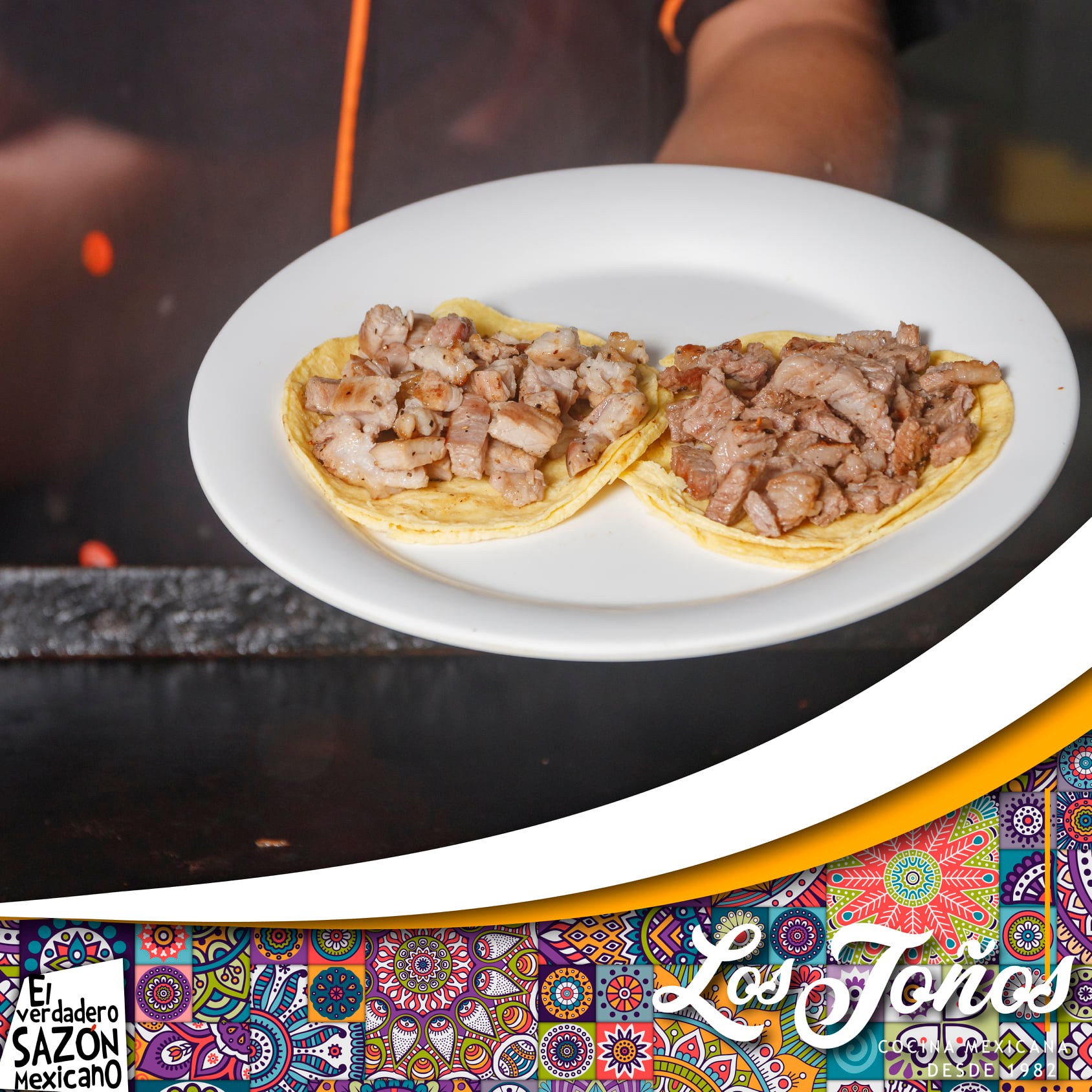 Bistec, chuleta, pastor, tocino, longaniza, cebolla, morrón, queso.