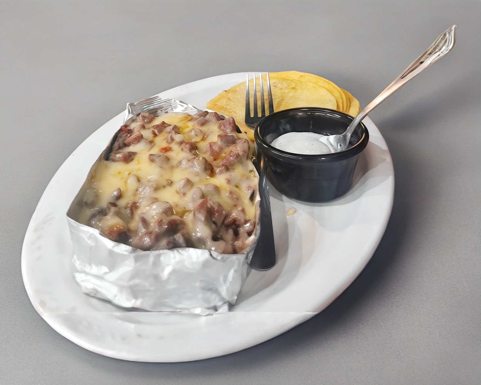 Porción de queso fundido con arrachera.