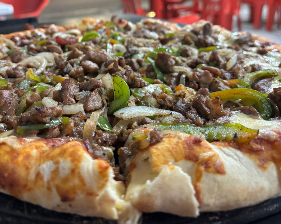 Salteado de carne al pastor con pimientos, cebolla, tocino y queso fundido.