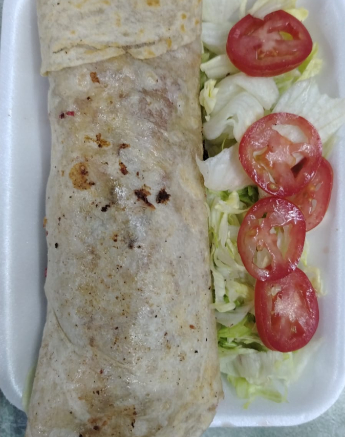 Burrito grande de tortilla de harina relleno de carne al pastor, frijoles y queso.